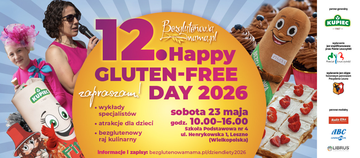 | Miejscowość: Leszno Miejsce: Szkoła Podstawowa nr 4 ul. Henrykowska, Leszno, dzielnica Zaborowo Data rozpoczęcia: 23.05.2026 10:00:00 Data zakończenia: 23.05.2026 16:00:00 Organizator: Stowarzyszenie Przyjaciół Bezglutenwej Mamy Opis wydarzenia: Zapraszamy do bezglutenowego raju, na największe w Polsce cykliczne wydarzenie bezglutenowe: targi, festyn, wykłady profesorów z Poznania i Warszawy, badania diagnostyczne w osteobusie (są zapisy), gra terenowa i teatrzyk dla dzieci, piknikowe przedszkole, darmowe lody i sorbety Grycan dla wszystkich dzieci. To jedyna okazja w roku, by spotkać tysiące ludzi na diecie bezglutenowej z całej Polski, i zjeść: - bezglutenowe hotdogi - gofry i naleśniki bezglutenowe z foodtrucka - pizzę - zapiekanki - spaghetti - kiełbaskę z grilla z pajdą chleba - pierogi w 3 smakach - ciasta, muffiny, eklery A wszystko 100% bezglutenowe. Wstęp jest wolny, zapraszamy do Leszna - do bezglutenowej stolicy Polski. Przyjedźcie z rodziną, ze znajomymi albo sami - i spędźcie jeden dzień w bezglutenowym raju. 12. Happy Gluten Free Day jest współfinansowany przez Powiat Leszczyński. Odbywa się pod honorowym patronatem prezydenta Leszna. Patronat medialny: radio Elka i gazeta ABC. Szczegóły: https://bezglutenowamama.pl/dziendiety2026 |