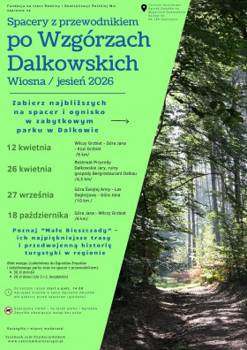 | Miejscowość: Dalków Miejsce: Wzgórza Dalkowskie , zabytkowy park, Ogrody Zmysłów Data rozpoczęcia: 26.04.2026 14:00:00 Data zakończenia: 26.04.2026 17:00:00 Organizator: Fundacja na rzecz Rodziny i Rewitalizacji Polskiej Wsi Opis wydarzenia: Wiosenne spacery z przewodnikiem po Wzgórzach Dalkowskich czas zacząć Kiedy się widzimy? 26 kwietnia Trasa: Rezerwat Przyrody Dalkowskie Jary - ruiny gospody Bergrestaurant Dalkau /4,5 km/ Start: godzina 14.00 (sprzedaż biletów chwilę wcześniej) Szczegóły na plakacie. To czas kiedy w lesie robi się wiosennie a spacery to czysta przyjemność Podczas spacerów opowiemy Wam o historii tego miejsca, której nie przeczytacie na żadnych tablicach... Pokażemy Wam też zdjęcia z okresu przedwojennego i przeczytamy wpisy z niezwykłego Pamiętnik Luise von Liebermann z Dalkowa będąc w miejscach, które opisywała dziedziczka pałacu dalkowskiego ponad 200 lat temu... To nie tylko spacer - to wędrówka po historię, nawiązywanie relacji podczas spaceru, chłonięcie przyrody całym sobą... Wejściówka obejmuje również całodniowy bilet wstępu do Ogrodów Zmysłów i zabytkowego parku a także możliwość skorzystania z ogniska po spacerze (kiełbaski weźcie we własnym zakresie ). Przyjedźcie całymi rodzinami - trasy będą przystępne dla każdej grupy wiekowej Bilet wstępu (całodniowy do Ogrodów Zmysłów i zabytkowego parku oraz na spacer z przewodnikiem): • 30 zł dorośli • 20 zł dzieci (do 3 r.ż. bezpłatnie) Dla komfortu wszystkich uczestników oraz bezpieczeństwa przyrody prosimy, aby psy uczestniczące w spacerze były prowadzone na smyczy. Prosimy również pamiętać, że na teren parku i Ogrodów Zmysłów nie ma możliwości wejścia ze zwierzętami - osoby, które zjawią się na spacerze ze swoim czworonogiem nie będą mogły skorzystać z tej części oferty. Do zobaczenia już w najbliższą niedzielę! Przypominamy, że w sobotę wracamy po świątecznej przerwie z Pałac i Folwark Dalków - Targ żywności, rękodzieła i roślin - Wystawcy z pysznym jedzeniem, rękodziełem i roślinami będą na Was czekać na przypałacowym folwarku w sobotę od 9-13.00. Ten weekend warto zaplanować w Dalkowie |