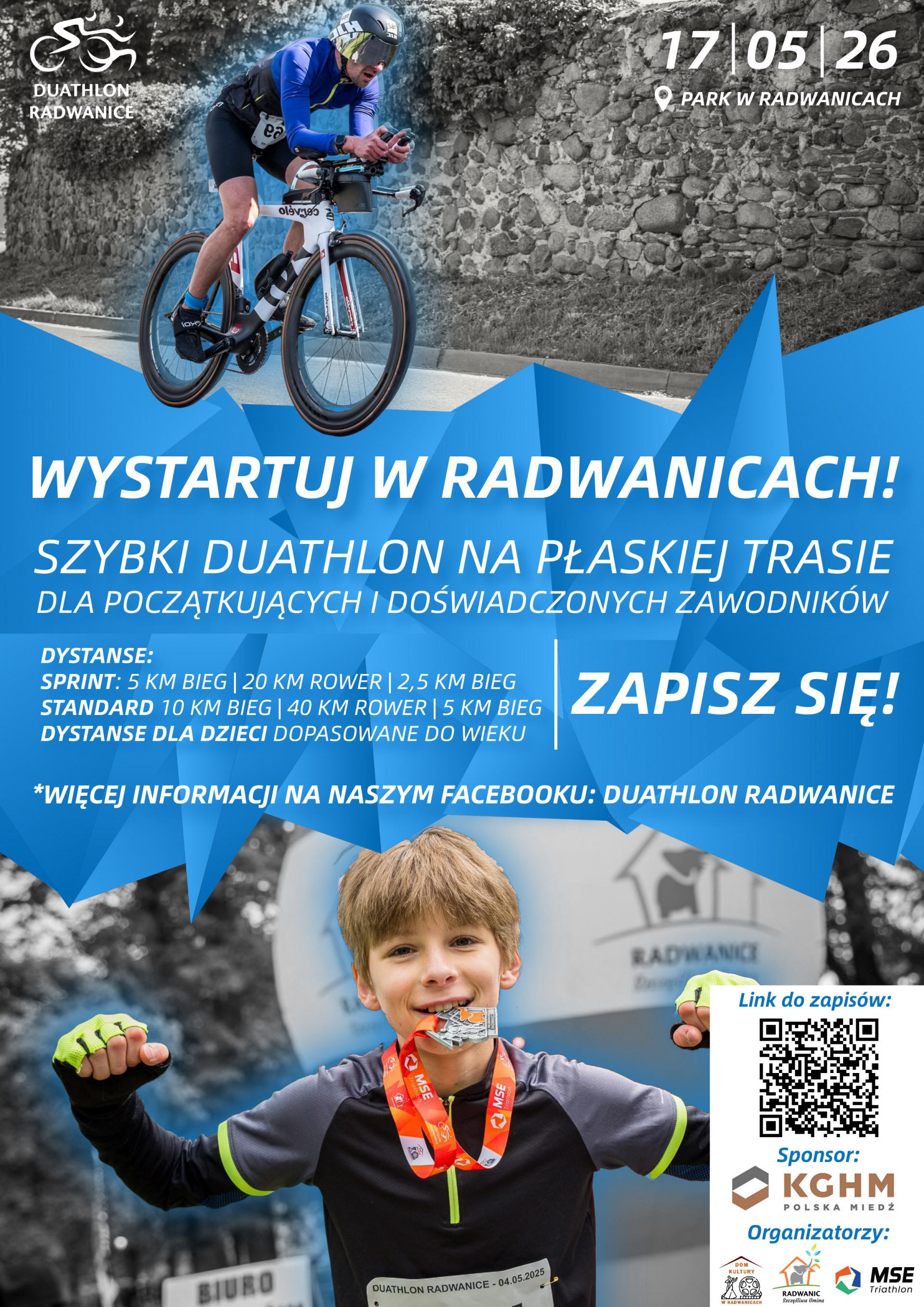 | Miejscowość: Radwanice Miejsce: Park w Radwanicach Data rozpoczęcia: 17.05.2026 09:00:00 Data zakończenia: 17.05.2026 14:00:00 Organizator: Dom Kultury w Radwanicach Opis wydarzenia: Duathlon Radwanice Duathlon Radwanice to wyjątkowe wydarzenie sportowe, które łączy dynamiczną rywalizację z przyjazną atmosferą. Zawody odbywają się na szybkich, płaskich trasach, a formuła NON DRAFTING gwarantuje uczciwą rywalizację – liczy się Twoja forma, strategia i determinacja. Start oraz meta zlokalizowane są w parku, co zapewnia komfort zawodnikom oraz doskonałe warunki do kibicowania. To idealna propozycja zarówno dla doświadczonych zawodników, jak i osób planujących swój pierwszy start w duathlonie. Dystanse dla dorosłych SPRINT 5 km biegu 20 km jazdy na rowerze 2,5 km biegu CLASSIC 10 km biegu 40 km jazdy na rowerze 5 km biegu Na dystansie CLASSIC istnieje również możliwość startu w sztafecie 2-osobowej – to świetna opcja dla tych, którzy chcą rywalizować zespołowo. GREAT KIDS – zawody dla dzieci Równolegle z rywalizacją dorosłych odbywają się zawody dla najmłodszych uczestników. To doskonała okazja, aby dzieci rozpoczęły swoją przygodę ze sportem w atmosferze zabawy i zdrowej rywalizacji. Dzieci z Gminy Radwanice do 16 r. ż. - mogą wziąć udział bezpłatnie. Kategorie wiekowe: 6–8 lat: 200 m bieg | 400 m rower | 200 m bieg 9–11 lat: 200 m bieg | 800 m rower | 200 m bieg 12–13 lat: 1200 m bieg | 2000 m rower MTB | 800 m bieg Udział w zawodach to nie tylko ruch, ale także budowanie pewności siebie, sportowego ducha i niezapomniane emocje. Zniżka dla mieszkańców Osoby zameldowane na terenie gminy Radwanice mogą skorzystać ze specjalnej oferty – 50% zniżki na wpisowe Dołącz do nas! Niezależnie od poziomu zaawansowania – Duathlon Radwanice to wydarzenie dla każdego. Sprawdź swoje możliwości, przeżyj sportowe emocje i dołącz do aktywnej społeczności. Zapisz się i wystartuj! Sponsorem wydarzenia jest: KGHM Polska Miedź S.A. |
