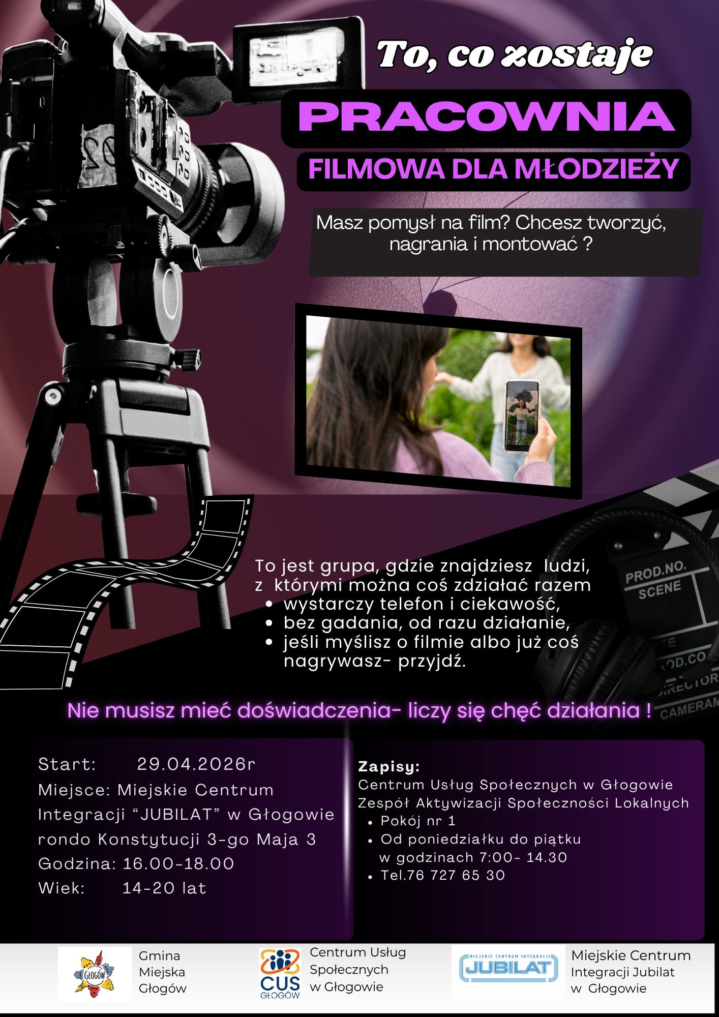 Centrum Usług Społecznych w Głogowie zaprasza młodzież do pracowni filmowej. Jest to inicjatywa skierowana do osób młodych, w wieku od 14 do 20 lat, które chcę rozwijać kreatywność i doskonalić swoje umiejętności.