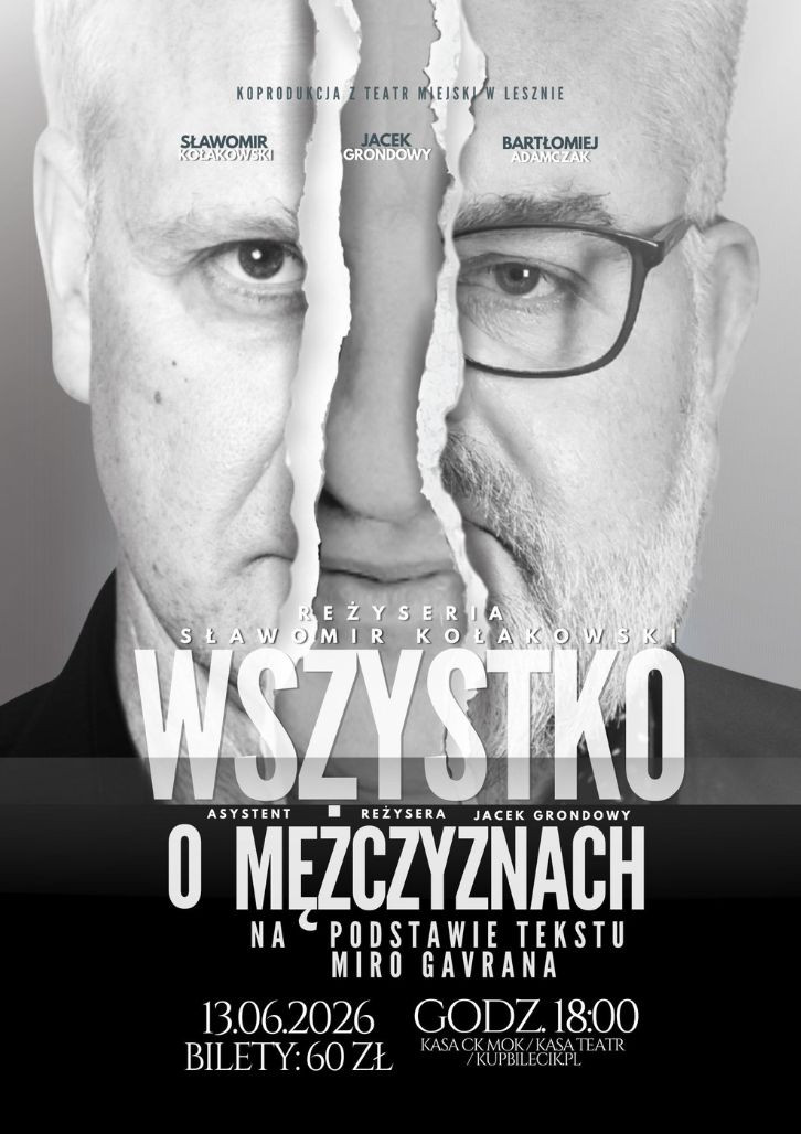 | Miejscowość: Głogów Miejsce: Teatr im. Andreasa Gryphiusa, Rynek 8 Data rozpoczęcia: 13.06.2026 18:00:00 Data zakończenia: 13.06.2026 19:00:00 Organizator: CENTRUM KULTURY W GŁOGOWIE Opis wydarzenia: 13.06.2026 r. GODZ. 18:00 Bilety: 60 zł Bilety dostępne w kasie Teatru - godzinę przed spektaklem (tel. 783 403 503), kasie CK oraz na kupbilecik.pl Spektakl „Wszystko o mężczyznach” Miro Gavrana to pełna humoru, wzruszeń i życiowych obserwacji podróż po świecie współczesnych mężczyzn. Twórcy prezentują widzom portret męskiej duszy – prostolinijnej, lecz niepozbawionej głębokich rozterek oraz osobistych dylematów. Na scenie odsłania się cała gama uczuć i emocji: od tęsknoty i pragnienia bliskości, przez samotność i strach, aż po siłę płynącą z przyjaźni i lojalności. Trzech utalentowanych aktorów wciela się w rozmaite postaci – bywalców siłowni, klubów nocnych, ludzi stojących w obliczu utraty bliskich. Każda scena, komiczna, przejmująca lub refleksyjna – pokazuje inne, czasem zaskakujące oblicze męskości, zdecydowanie odbiegające od stereotypów. Zestawienie energii, błyskotliwych dialogów i znakomitego warsztatu aktorskiego tworzy widowisko, które bawi, ale również pozostawia przestrzeń na refleksję o tym, co naprawdę jest ważne w męskim świecie. Spektakl skłania do zastanowienia nad tym, co buduje, a co burzy męską tożsamość – daje widzom impuls do zadania sobie pytania o sens, relacje i głębię codziennych wyborów. |