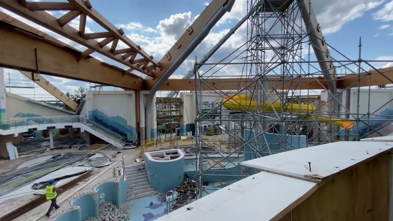 Niewiele pozostało z dawnego wnętrza hali basenowej polkowickiego Aquaparku. Trwają tam zaawansowane prace rozbiórkowe. Na ten moment warta około 86 mln zł inwestycja idzie zgodnie z planem, choć nie obyło się bez niespodzianek. Nowa hala basenowa, nawiązująca stylem do tematyki wakacji, ma być gotowa za około rok. W czwartkowe popołudnie plac budowy wizytowali radni oraz władze gminy.