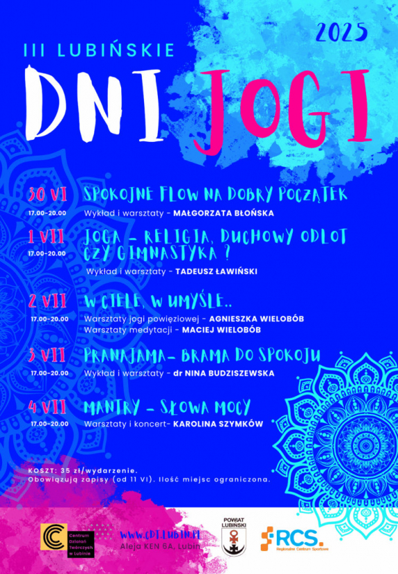w Lubinie. - Każdy dzień mamy nazwany. Spokojny flow na dobry początek. Wykład i warsztaty i tym zajmie się Małgorzata Błońska. 1 lipca joga, religia, duchowy odlot czy gimnastyka - wykład i warsztaty. W środę "W Ciele i w Umyśle" - warsztaty jogi powięziowej. W czwartek zapraszamy na "PRANAJAMA - BRAMA DO SPOKOJU" - wykład i warsztat. A zawsze piątek kończymy koncertem, czyli mantry, słowa mocy, warsztaty i koncert. I to wszystko będzie się działo w Centrum Działań Twórczych w godzinach od 17 do 20 codziennie. Można zapisać się na każdy dzień osobno - podkreśla.