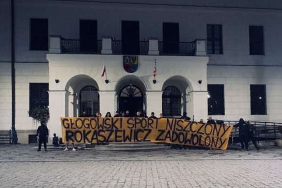 „Głogowski sport niszczony, Rokaszewicz zadowolony!” – taki transparent przed budynkiem urzędu zaprezentowali kibice piłkarskiego Chrobrego. Zarzucają oni włodarzowi miasta oraz zarządowi klubu ignorancję, prowadzenie polityki antykibicowskiej oraz działania mogące doprowadzić do degradacji. Na oświadczenie kibiców odpowiedział prezydent Głogowa.