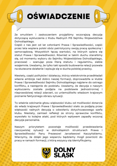 W sieci pojawiło się już oświadczenie wyrzuconych radnych, którzy z rozgoryczeniem komentują decyzję władz partii. Podkreślają, że „ze smutkiem i zaskoczeniem” przyjęli informację o wykluczeniu, a cała sytuacja jest wynikiem „jednostronnej i nieprawdziwej relacji zdarzeń”, która trafiła do centrali. Dodają, że „część polityków i działaczy wielokrotnie przedkładała własne ambicje nad dobro formacji”, co doprowadziło do eskalacji konfliktu - czytamy m.in. w oświadczeniu.