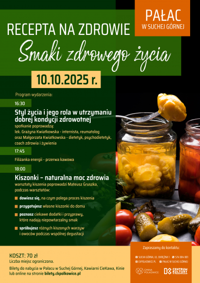 Już w przyszłym tygodniu (10 października) - w Pałacu w Suchej Górnej odbędzie się druga odsłona wydarzenia z cyklu „Recepta na zdrowie”. Tym razem spotkanie odbędzie się pod hasłem Smaki zdrowego życia, a uczestnicy nie tylko posłuchają wartościowego wykładu o zdrowiu, ale też nauczą się kisić warzywa!