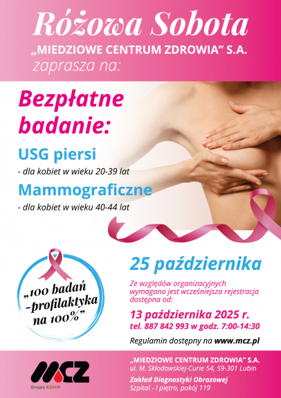 KGHM zaprasza na akcję "Różowa Sobota" - 25 października w MCZ w Lubinie100 mammografii i 100 USG piersi |