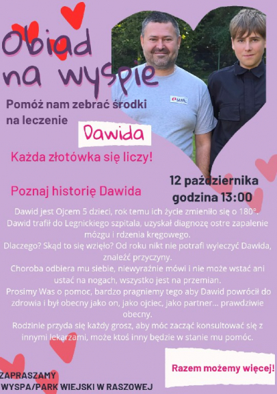 To będzie więcej niż tylko wspólny posiłek - to gest solidarności, który może odmienić czyjeś życie. W niedzielę, 12 października o godzinie 13:00, w urokliwym parku w Raszowej odbędzie się wyjątkowe wydarzenie - charytatywny Obiad na Wyspie, którego celem jest wsparcie Dawida Góry, 41-letniego mieszkańca gminy Lubin, ojca pięciorga dzieci i druha OSP, walczącego z ciężką, wyniszczającą chorobą neurologiczną.