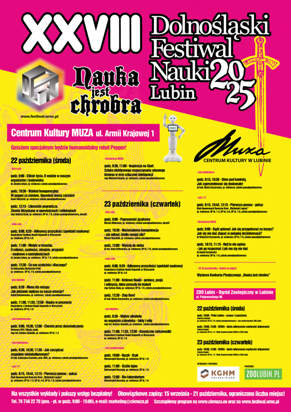 Dyżurny reporter: ![]() Tegoroczna edycja DFN odbywa się pod hasłem „Nauka jest chrobra”, które nawiązuje do 1000. rocznicy koronacji pierwszego króla Polski - Bolesława Chrobrego. W programie nie zabraknie fascynujących wykładów, inspirujących warsztatów i spotkań z ludźmi, którzy potrafią z pasją opowiadać o niezwykłym świecie nauki. - Ogromnie się cieszymy, bo to wyjątkowa impreza - mówi Małgorzata Życzkowska-Czesak, dyrektor CK „Muza”. - W tym roku odbywa się 22 i 23 października i przez te dwa dni odwiedzi nas blisko 5 tysięcy dzieci i młodzieży. Od wielu lat współpracujemy również z Centrum Nauki Kopernik w Warszawie - ich naukowe pokazy i spektakle przyciągają tłumy i zawsze robią ogromne wrażenie. Nie zabraknie też prawdziwej gwiazdy technologii. Do Lubina przyjedzie humanoidalny robot Pepper, który powita uczestników i pojawi się na scenie. ![]() Wśród zaproszonych gości znalazł się również Maciej Makselon, znany popularyzator poprawności językowej. W programie przewidziano m.in. zajęcia w ZOO Lubin, naukowe zabawy w mobilnym centrum SOWA, warsztaty z fizyki i chemii, a także biolaboratorium dla młodych odkrywców. Pełen program dostępny jest na stronie: www.ckmuza.eu.