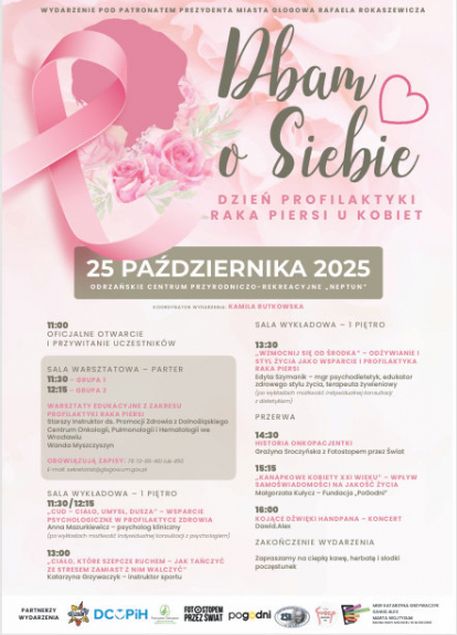 Dyżurny reporter: 667 70 70 60 - Szczególnie zachęcam do skorzystania z warsztatów w zakresie profilaktyki raka piersi. Warsztaty trwają około 30 minut. Przewidziałyśmy dwie grupy warsztatowe. Pierwsza zaczyna się o 11:30, druga o 12:15. Warsztaty poprowadzi starszy instruktor do spraw promocji zdrowia z Dolnośląskiego Centrum Onkologii, Pulmonologii i Hematologii we Wrocławiu, Wanda Myszczyszyn. Podczas warsztatów poznamy czynniki ryzyka nowotworu piersi. Dowiemy się jak i kiedy wykonywać samobadanie piersi lub jakie badania powinnyśmy wykonywać w zależności od wieku. Będzie również część praktyczna na fantomach - mówi koordynatorka. Zapisy trwają do piątku, 24 października do godziny 15.30 pod nr tel. 76 7265 401 lub 450 lub mailowo sekretariat@glogow.um.gov.pl. Jednym z zaproszonych gości będzie głogowska podróżniczka Grażyna Sroczyńska, która przeszła chorobę nowotworu piersi i opowie o swojej historii. - Chciałaby opowiedzieć tak naprawdę o tym, jak bardzo czuła się zagubiona podczas tej choroby, jak ciężko było jej przebrnąć przez takie podstawowe rzeczy, typu przygotowanie się do szpitala czy do zabiegu - dodała K. Rutkowska. Szczegółowy program wydarzenia na plakacie.