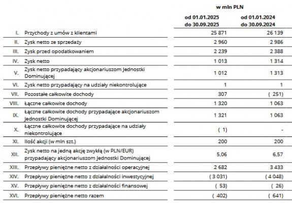 13. Dodane przez Economist, w dniu - 15-11-2025 17:37 291 Co za brednie. Zysku netto jest o 300 mln mniej niż w analogicznym okresie zeszłego roku. Obecne mamy nieco ponad 1 mld a było 1,3 mld. Przekłada się to np na zysk na akcje. Po III kw tego roku zysk na 1 akcję notowaną na giełdzie to 5,06 zł a w analogicznym okresie zeszłego roku było to 6,57 zł na akcje.
