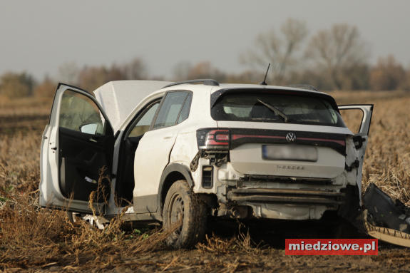 z drogi gminnej podporządkowanej nie ustąpił pierwszeństwa innemu volkswagenowi, który poruszał się w stronę Głogowa. Doszło do zderzenia. Musiało być ono bardzo mocne, bo jedno z auto wylądowało w rowie, a drugie na polu.