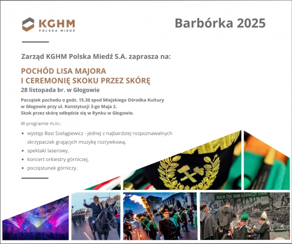 28 listopada na konta pracowników KGHM trafi nagroda z okazji Dnia Górnika w wysokości miesięcznego wynagrodzenia. Tego samego dnia w Głogowie rozpoczną się główne obchody Barbórki, podczas których zaplanowano uroczystą akademię, pochód Lisa Majora oraz tradycyjne karczmy.