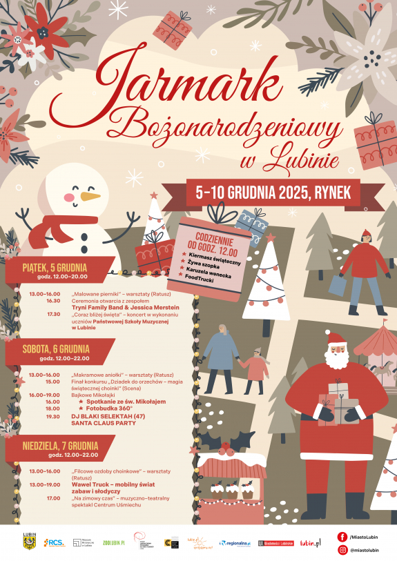 Prezydenta Lubina. - W sobotnie popołudnie Rynek zamieni się w przestrzeń rodzinnej zabawy w ramach Bajkowych Mikołajek, które potrwają od 16.00 do 19.00. W programie mamy oczywiście spotkanie ze św. Mikołajem o 16.00 oraz możliwość skorzystania z fotobudki 360°, dzięki czemu goście będą mogli zabrać ze sobą pamiątkę z jarmarku. W niedzielę od 13.00 do 19.00 na Rynku znów pojawi się świąteczna ciężarówka, tym razem będzie to Wawel Truck, czyli mobilna strefa atrakcji z zabawami i słodkimi niespodziankami. Jarmark Bożonarodzeniowy w Lubinie to wydarzenie pomyślane tak, żeby każdy znalazł coś dla siebie - od spokojnego spaceru między stoiskami, przez rodzinne warsztaty, po koncerty i spektakle - dodaje.