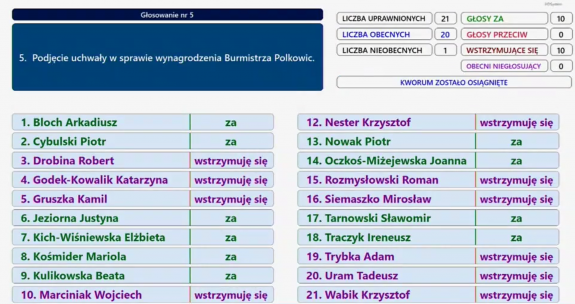 Podczas dyskusji nad projektem uchwały żaden z radnych nie zabrał głosu. W głosowaniu uczestniczyło 20 radnych: 10 poparło podwyżkę, a 10 wstrzymało się od głosu. Mimo braku większości bezwzględnej, uchwała została przyjęta i zacznie obowiązywać z mocą wsteczną od 1 lipca 2025 roku. Burmistrz otrzyma wyrównanie za ten okres.