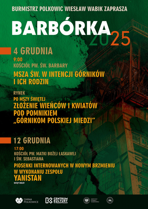 Polkowice od lat z dumą pielęgnują tradycję Barbórki, jednego z najważniejszych świąt górniczej społeczności. Wraz z Burmistrzem Polkowic zapraszają wszystkich mieszkańców do wspólnego świętowania podczas wyjątkowych wydarzeń przygotowanych na tę okazję w czwartek - 4 grudnia.