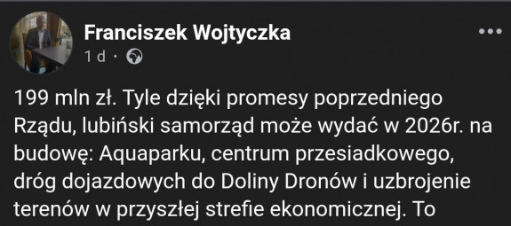 53. Dodane przez Piti, w dniu - 03-12-2025 15:43 11 199mln zł tyle może Lubin wydać w 2026r na inwestycje m.in. na uzbrojenie Strefy Przemysłowej. Pan Franciszek Wojtyczka na Fb o tym napisał.