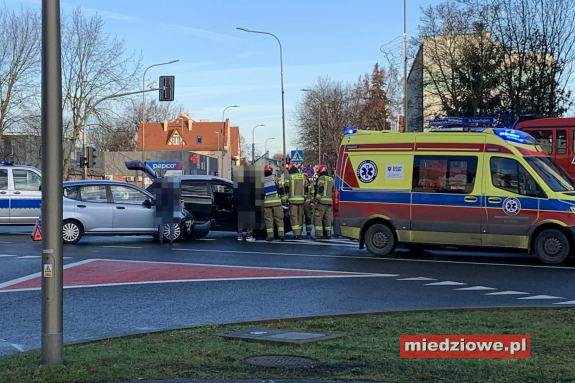 Poważne zdarzenie drogowe na głównym skrzyżowaniu z sygnalizacją świetlną przy ul. Niepodległości i ul. Marii Skłodowskiej-Curie w Lubinie. Zderzyły się tam dwa samochody osobowe. Na miejscu pracują straż pożarna, policja oraz pogotowie ratunkowe - w karetce znajduje się jedna osoba.