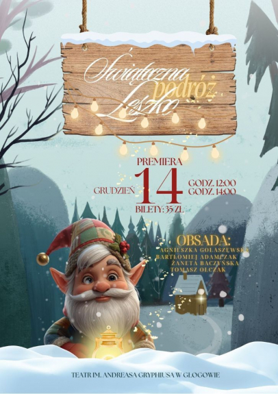Dyżurny reporter: 667 70 70 60 - Jest to niesamowita okazja do tego, żebyśmy nastroili się już i byli w tym całym świątecznym klimacie, który zaraz nadejdzie. Dwie elfki, Zosia i Tosia, Mikołaj, no i Leszko. Chochlik Leszko, który wybiera się z nami w wielką podróż i zwiedza cały świat. Poznaje wartości, tradycje, kulturę, która towarzyszy przy świętach Bożego Narodzenia. Jest to dodatkowo spektakl bardzo interaktywny. Dzieciaczki wchodzą na scenę, śpiewają, tańczą razem z nami, robią to i na scenie i na widowni, bawią się przy tym maluchy, bawią się przy tym dorośli i bawimy się my również, bo jest to dla nas niesamowita energia oddana z widowni właśnie do aktorów - opowiada Żaneta Baczyńska, kierownik teatru. Do tego dochodzi przepiękna muzyka. Zabawa się szykuje przednia. Spektakl o 12:00 jest już wyprzedany, ale można jeszcze kupić wejściówki na niedzielę na godzinę 14:00. - Będzie Mikołaj, będzie muzyka, będą cukierki, będzie wszystko. Choinki, światełka, będzie przepięknie. Dzieci bardzo szybko powiedzą, czy im się to podoba, czy nie - dodała kierowniczka teatru. Oprócz Ż. Baczyńskiej w spektaklu zagrają: Bartłomiej Adamczak, Tomasz Olczak i Agnieszka Gołaszewska. Bilety do nabycia w cenie 35 złotych.