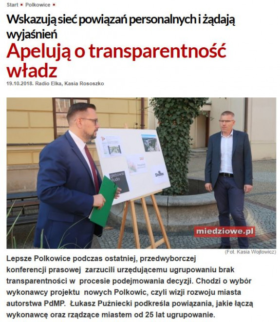 "Lepsze Polkowice podczas ostatniej, przedwyborczej konferencji prasowej zarzucili urzędującemu ugrupowaniu brak transparentności w procesie podejmowania decyzji. Chodzi o wybór wykonawcy projektu nowych Polkowic, czyli wizji rozwoju miasta autorstwa PdMP. Łukasz Puźniecki podkreśla powiązania, jakie łączą wykonawcę oraz rządzące miastem od 25 lat ugrupowanie. " https://miedziowe.pl/content/view/89405/81