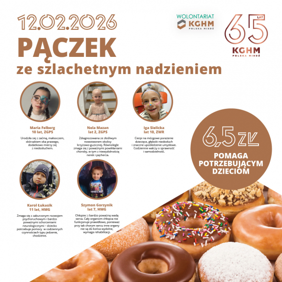 Już jutro "Tłusty Czwartek". W KGHM to coś więcej niż słodka tradycja. To dzień, w którym pączek nabiera wyjątkowego znaczenia - staje się symbolem solidarności i realnego wsparcia. Przed nami kolejna odsłona akcji „Pączek ze szlachetnym nadzieniem”. Już od najwcześniejszych godzin porannych wolontariusze będą dystrybuować pączki we wszystkich oddziałach spółki, a dochód z ich sprzedaży trafi na leczenie i rehabilitację dzieci pracowników miedziowej spółki.