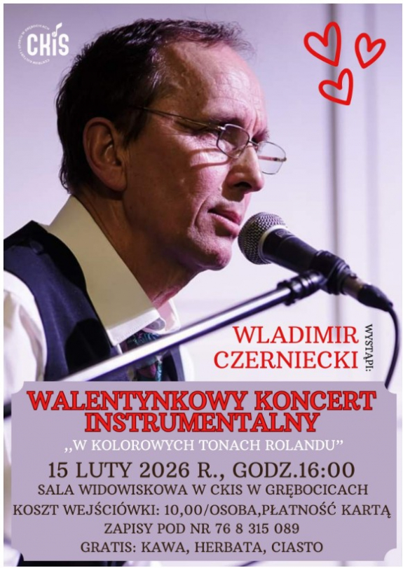 Romantyczne brzmienia, subtelne emocje i muzyczna podróż pełna barw, tak zapowiada się Walentynkowy Koncert Instrumentalny „W kolorowych tonach Rolandu”. Już 15 lutego o godz. 16:00 Centrum Kultury i Sportu w Grębocicach zaprasza na wyjątkowe popołudnie z muzyką, która porusza serca i tworzy niepowtarzalny klimat. Na scenie wystąpi Władimir Czerniecki, utalentowany instrumentalista, który zabierze publiczność w romantyczną podróż pełną ciepłych, nastrojowych brzmień.