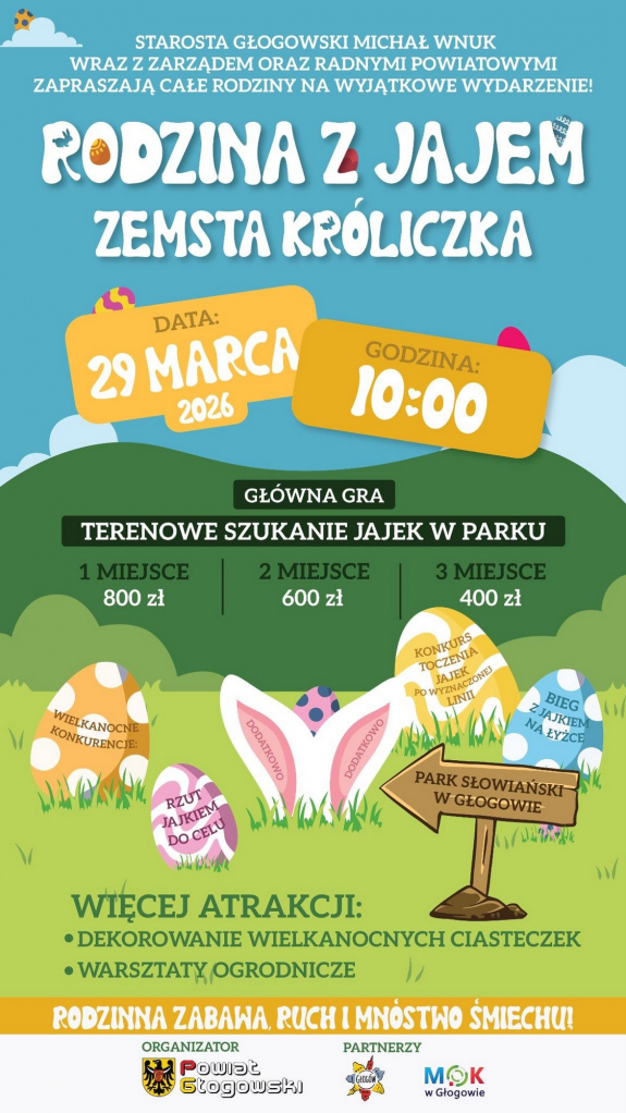 Władze powiatu głogowskiego wraz z radnymi robią drugie podejście do zabawy „Rodzina z jajem” – tym razem z dopiskiem „Zemsta króliczka”. Całe rodziny mogą czuć się zaproszone 29 marca przed godziną 10:00 do Parku Słowiańskiego w Głogowie.