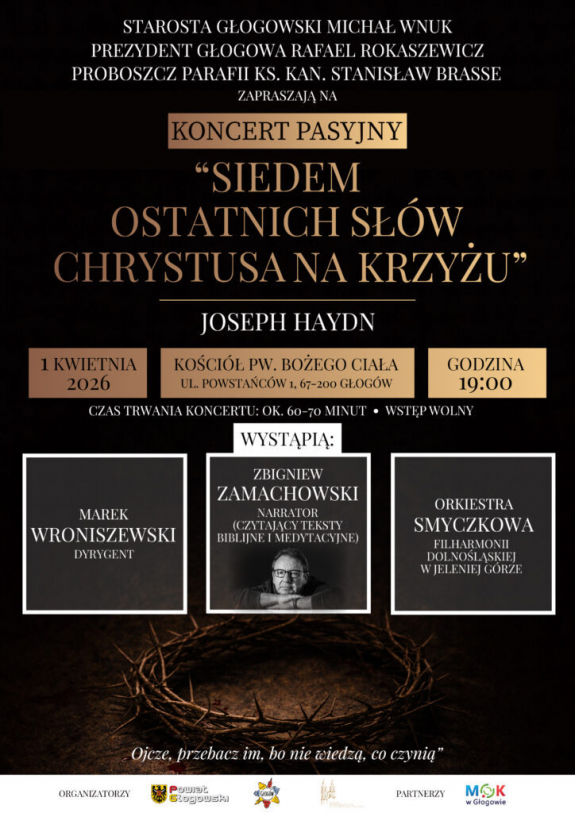 Dyżurny reporter: 667 70 70 60 - Zapraszamy wszystkich mieszkańców Ziemi Głogowskiej na wyjątkowe kulturalne wydarzenie - powiedział prezydent miasta Rafael Rokaszewicz. - Ostatnie siedem słów Jezusa Chrystusa na krzyżu w wykonaniu Filharmonii Dolnośląskiej pod batutą dyrygenta Marka Wroniszewskiego z interpretacją słów Chrystusa, intonacją Zbigniewa Zamachowskiego - dodał starosta głogowski Michał Wnuk. - Kończy się Wielki Post. To szczególny koncert, ale też szczególna data. Na kilkanaście godzin przed rozpoczęciem najważniejszych dni dla wszystkich wierzących Triduum Paschalnego ten wyjątkowy koncert, to wyjątkowe dzieło, które jestem głęboko przekonany, pomoże nam jeszcze głębiej, jeszcze bardziej przeżyć te święta przez sztukę do Boga - powiedział ks. kanonik Stanisław Brasse. To będzie jedno z najbardziej poruszających dzieł muzyki sakralnej, składające się z siedmiu części - muzycznych interpretacji słów Chrystusa wypowiedzianych na krzyżu. ![]() Podczas koncertu wystąpi 15-osobowy zespół Filharmonii Dolnośląskiej z Jeleniej Góry pod batutą dyrygenta Marka Wroniszewskiego. Narratorem wydarzenia będzie Zbigniew Zamachowski, który odczyta teksty biblijne i medytacyjne, wprowadzając publiczność w atmosferę skupienia i zadumy.