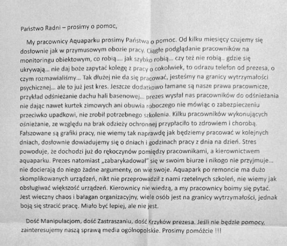 18. Dodane przez Krzyk rozpaczy z Aquaparku !, w dniu - 01-04-2026 17:01 41 "Radni składają zawiadomienie do PIP. Przymusowy obóz pracy, tak dramatycznymi słowami pracownicy Aquaparku Polkowice S.A. opisują sytuację wewnątrz spółki, w liście anonimowym kierowanym do burmistrza i radnych. Podczas gdy prezes ma unikać dialogu, a burmistrz, jako reprezentant właściciela, pozostaje bierny, radni miejscy biorą sprawy w swoje ręce i wnioskują o pilną kontrolę Państwowej Inspekcji Pracy."