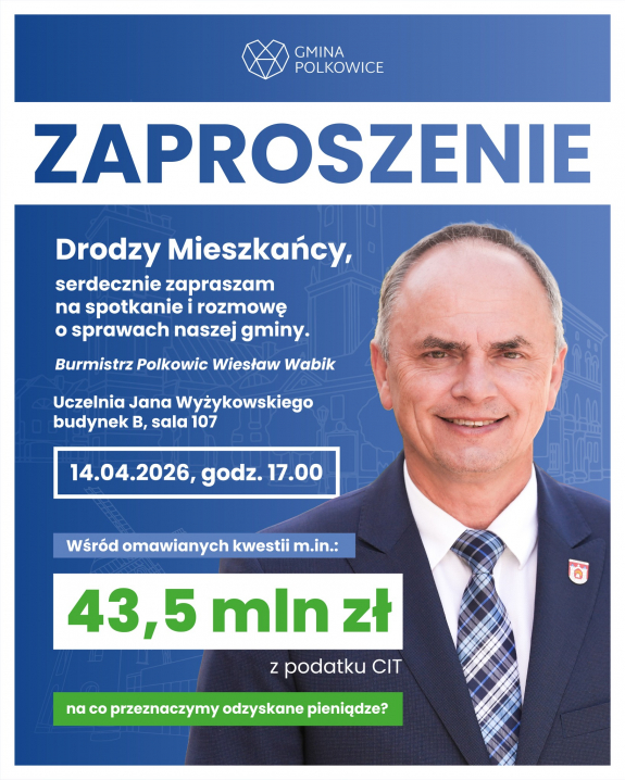 Przed mieszkańcami Polkowic kolejna okazja do bezpośredniej rozmowy z władzami gminy i realnego wpływu na jej przyszłość. Już 14 kwietnia podczas otwartego spotkania poruszony zostanie jeden z najważniejszych tematów ostatnich tygodni - sposób zagospodarowania ponad 43,5 mln zł pozyskanych z podatku CIT.
