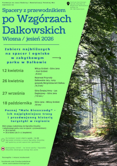 też sobie dadzą radę. Będziemy wędrować Wilczym Grzbietem, Kozim Grzbietem, a naszym punktem docelowym będzie Góra Jana, czyli jeden z najwyższych szczytów w okolicy. Są to naprawdę bardzo ładne, malownicze trasy, a poza tym, że można pospacerować na łonie natury, właśnie chłonąć tą przyrodę całym sobą. W trakcie spaceru opowiadamy ciekawostki historyczne, których tak naprawdę nie dowiemy się z żadnych tablic, bo takich nie ma na terenie akurat tego regionu Wzgórz Dalkowskich, a jest bardzo dużo takich ciekawostek o tym jak funkcjonowała turystyka przedwojenna w tym regionie - powiedziała Anna Gomułka, prezes Fundacji Na Rzecz Rodziny i Rewitalizacji Polskiej Wsi w Dalkowie.