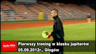 Po raz pierwszy na głównej arenie stadionu przy ul. Wita Stwosza trening przy sztucznym oświetlenie odbyli piłkarze Chrobrego Głogów. Zajęciom przyglądała się grupka piłkarskich fanów.