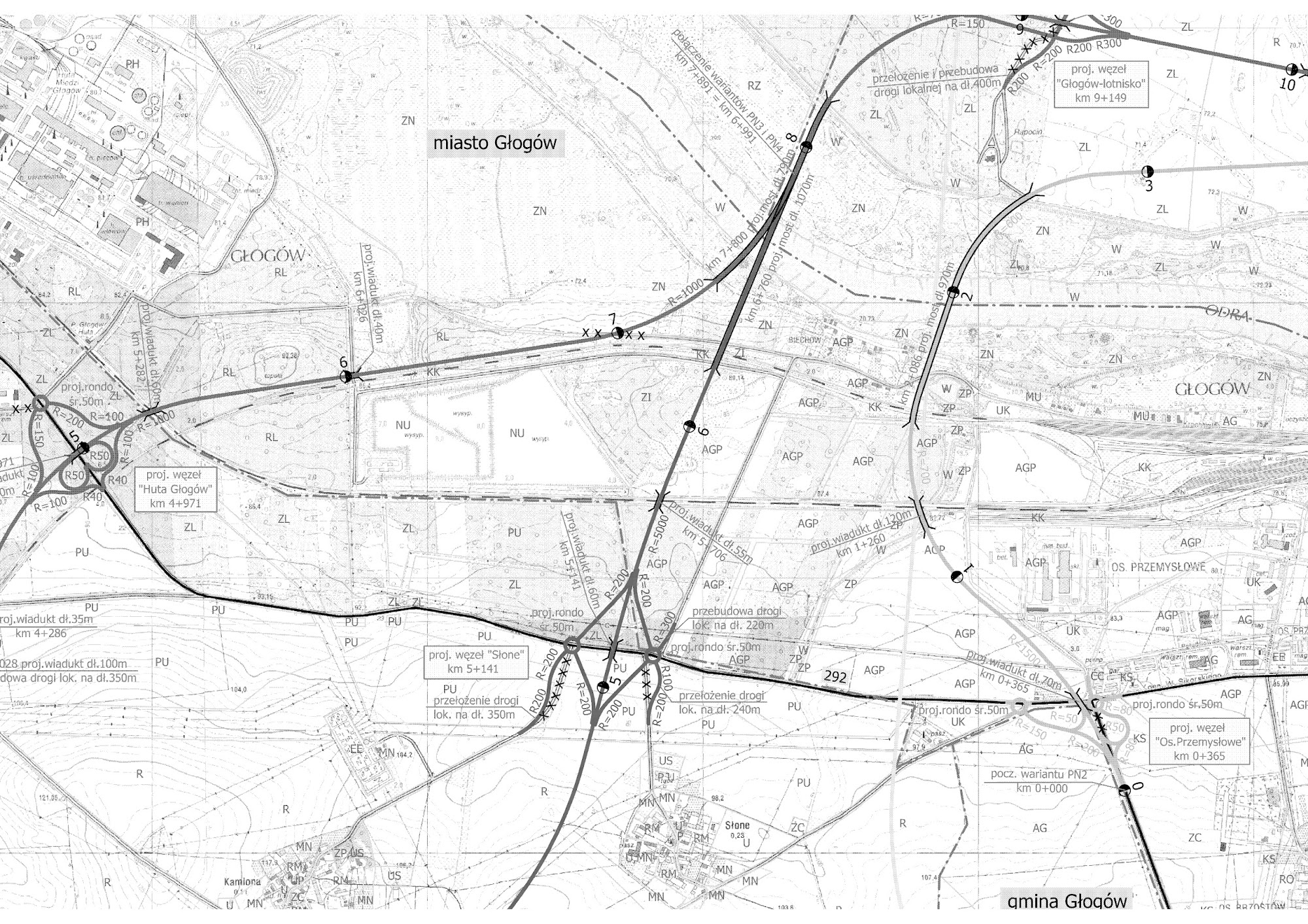Wariant północny PN4 Trasa ma długość 16,3 km. Obwodnica Dankowic od km 0+000 do 0+700. Na trasie przewidziano 12 obiektów mostowych, w tym 11 obiektów w ciągu drogi (o łącznej długości 1805 m) oraz 1 obiekt ponad drogą (o długości 60 m). Najdłuższe obiekty mostowe zaplanowano w km 3+509 (160 m estakada nad linią kolejową i potokiem Struga w Nielubii), w km 8+253 (1070 m most na Odrze), w km 12+772 (100 m wiadukt nad koleją i drogą nr 319 w Serbach). Na trasie przewiduje się 3 węzły drogowe dwupoziomowe - Słone" z drogą wojewódzką nr 292 w km 6+634, Głogów-lotnisko" z drogą wojewódzką nr 321 w km 9+742 oraz Serby" z drogą wojewódzką nr 319 w km 12+798." Informacje wziąłem z bardzo ciekawego opracowania na temat naszej obwodnicy, 116 stron, dużo obrazków polecam przeczytać. http://www.irt.wroc.pl/aktualnosci/download/f(...)doc_id/288.html