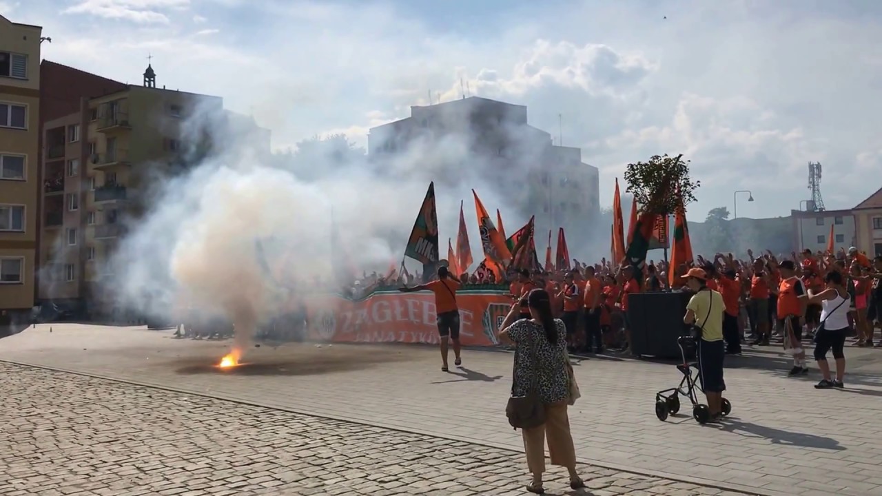 specjalny videoklip promujący dzisiejszy pochód i mecz Zagłębia Lubin z Zagłębiem Sosnowiec. Już przed godziną 16. w rynku gromadziły się tłumy kibiców. Kilkanaście minut później fani ruszyli w barwnym pochodzie. Powiewały flagi, były transparenty, odpalano race świetlne, a także świece dymne i petardy.