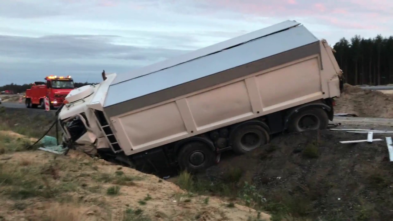 Kierowca ciężarówki stracił panowanie nad kierownicą i zjechał na przeciwległy pas ruchu zderzając się z tirem na numerach rejestracyjnych z Macedonii. Oba ciężkie pojazdy stoczyły się ze skarpy. Ranna została pasażerka samochodu osobowego, która została przetransportowana do lubińskiego szpitala.