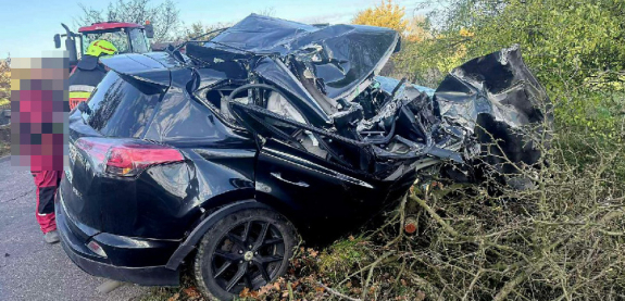 Kierowca uderzył w przyczepę, auto całkowicie zniszczone