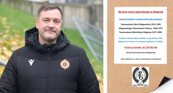 | Głogów 11 grudnia w Teatrze im. Andreasa Gryphiusa odbędzie się uroczysta gala organizowana przez Towarzystwo Ziemi Głogowskiej z okazji 80-lecia ruchu regionalnego w powojennym Głogowie. Do gali jeszcze sporo czasu, ale już teraz za naszym pośrednictwem organizatorzy apelują o kontakt wybrane osoby. więcej>> | ||||||||